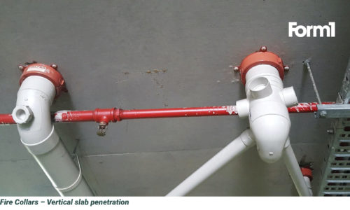 Here is an example of fire collars in use. They contain intumescent materials that expand rapidly with heat, to effectively seal the penetration and resist fire burning from one level to the next.